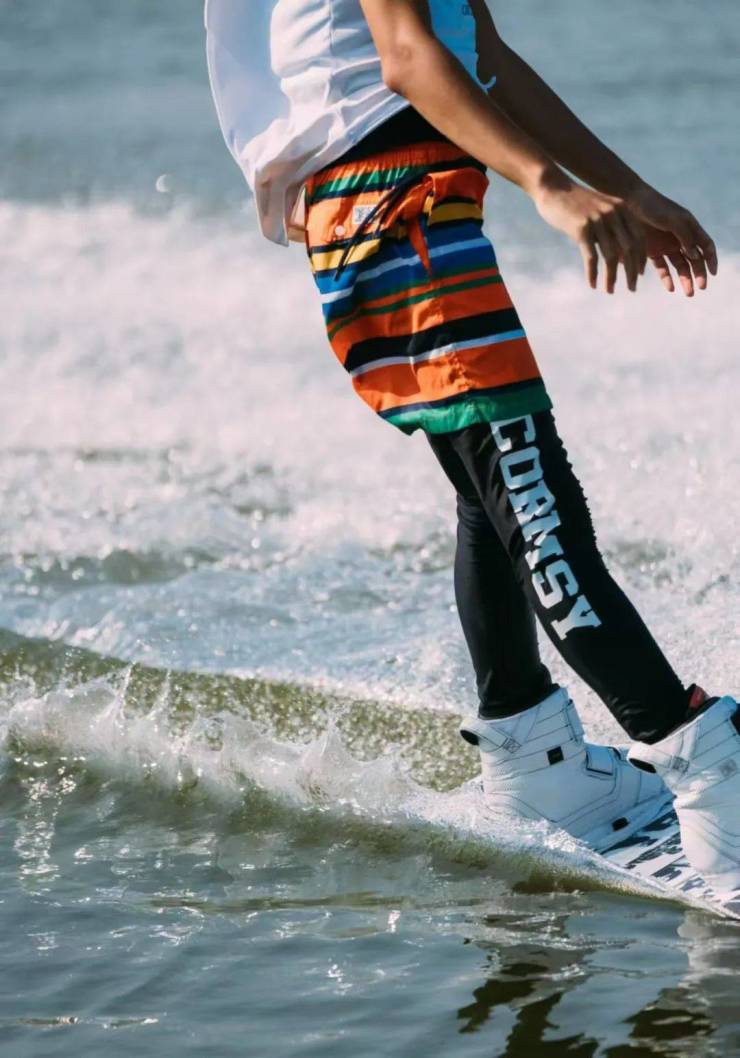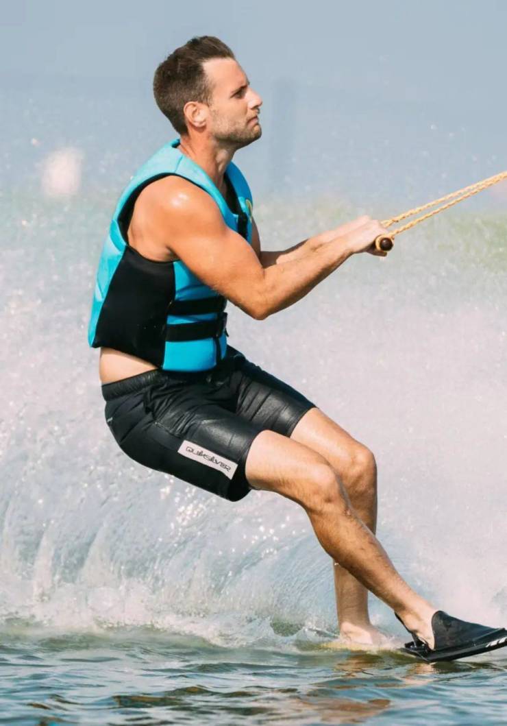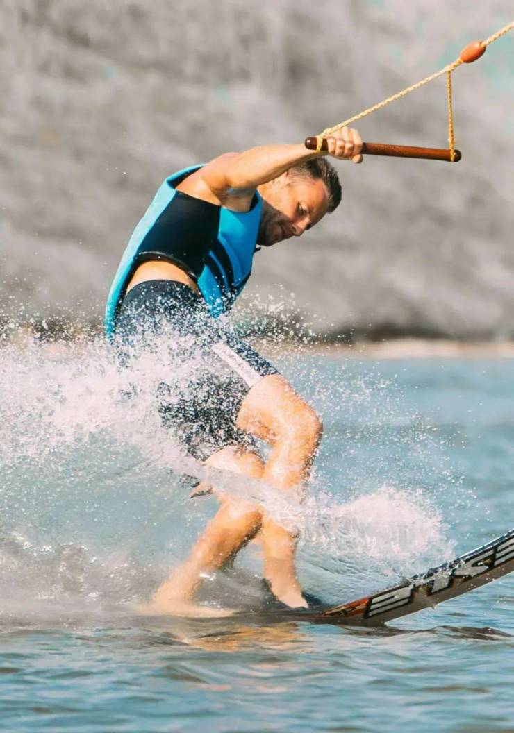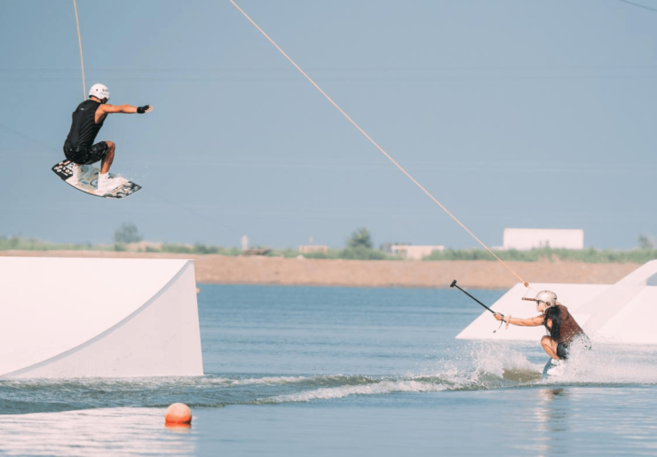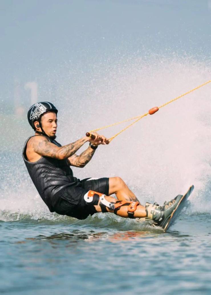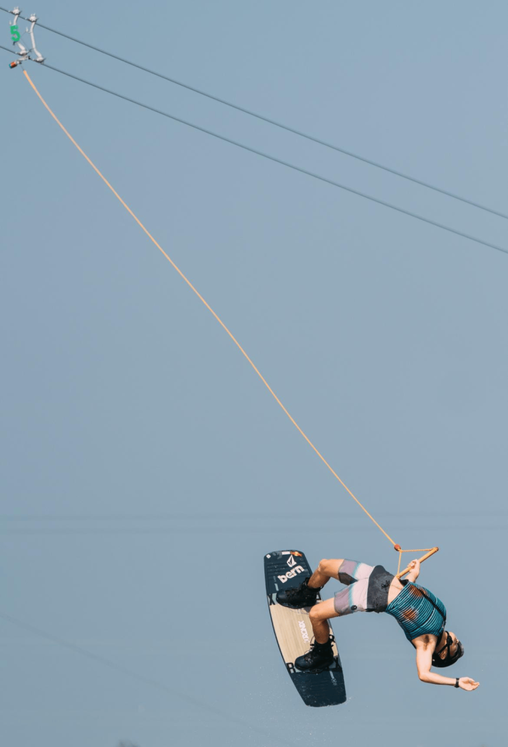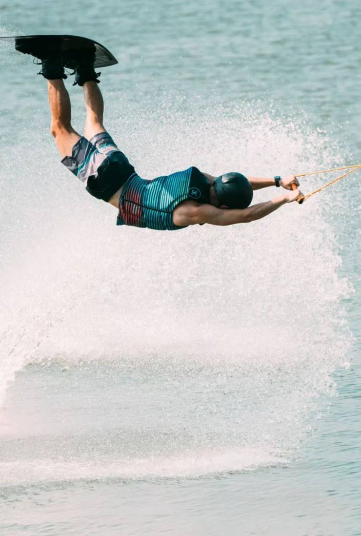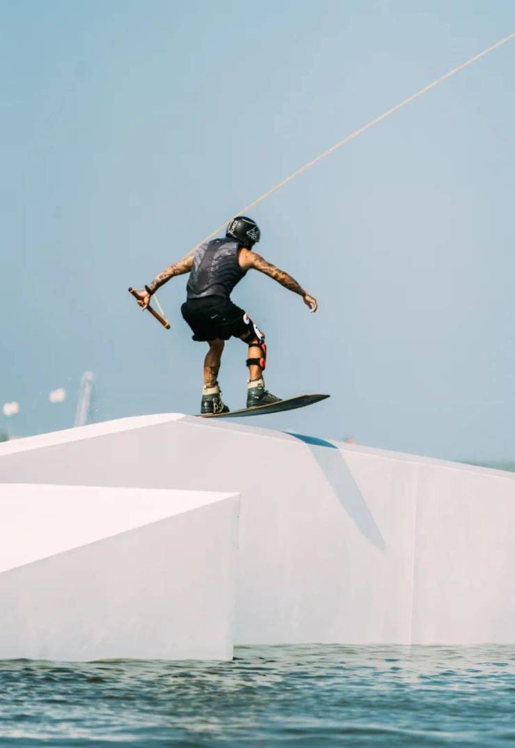 阿那亚索道滑水分为单板和双板两种形式,其中高阶滑水单板采用的是DUP品牌的高阶滑水板,板子的外型酷似滑雪的单板,板体上表靠近中部设有固定的脚套,独特外型通过索道牵引设备进行滑行的水上运动,环形道的跳台,给予滑水者更大的空间和时间完成难度更大的翻转、跳跃、回旋等一系列动作。由于板体在水中的面积较大,稳定性较高,适合初学者体验,索道滑水因此也成为滑水运动中发展最快并具有巨大发展潜力的项目,深受广大爱好者特别是青少年的喜爱。