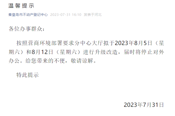 秦皇岛市不动产登记中心通知!各位办事群众:按照营商环境部署要求分中心大厅拟于2023年8月5日(星期六)和8月12日(星期六)进行升级改造,届时将停止对外办公。给您带来的不便,敬请谅解。特此提示2023年7月…