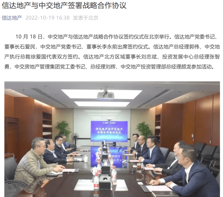 从出席高管名单中可看出双方的重视程度:信达地产方面,党委书记、董事长石爱民,总经理郭伟,以及北方区域董事长刘忠斌、投资发展中心总经理张智勇;中交地产方面,党委书记、董事长李永前,执行总裁徐爱国,中交房地产管理集团党工委书记、总经理刘辉,以及中交地产投资管理部总经理颜龙。