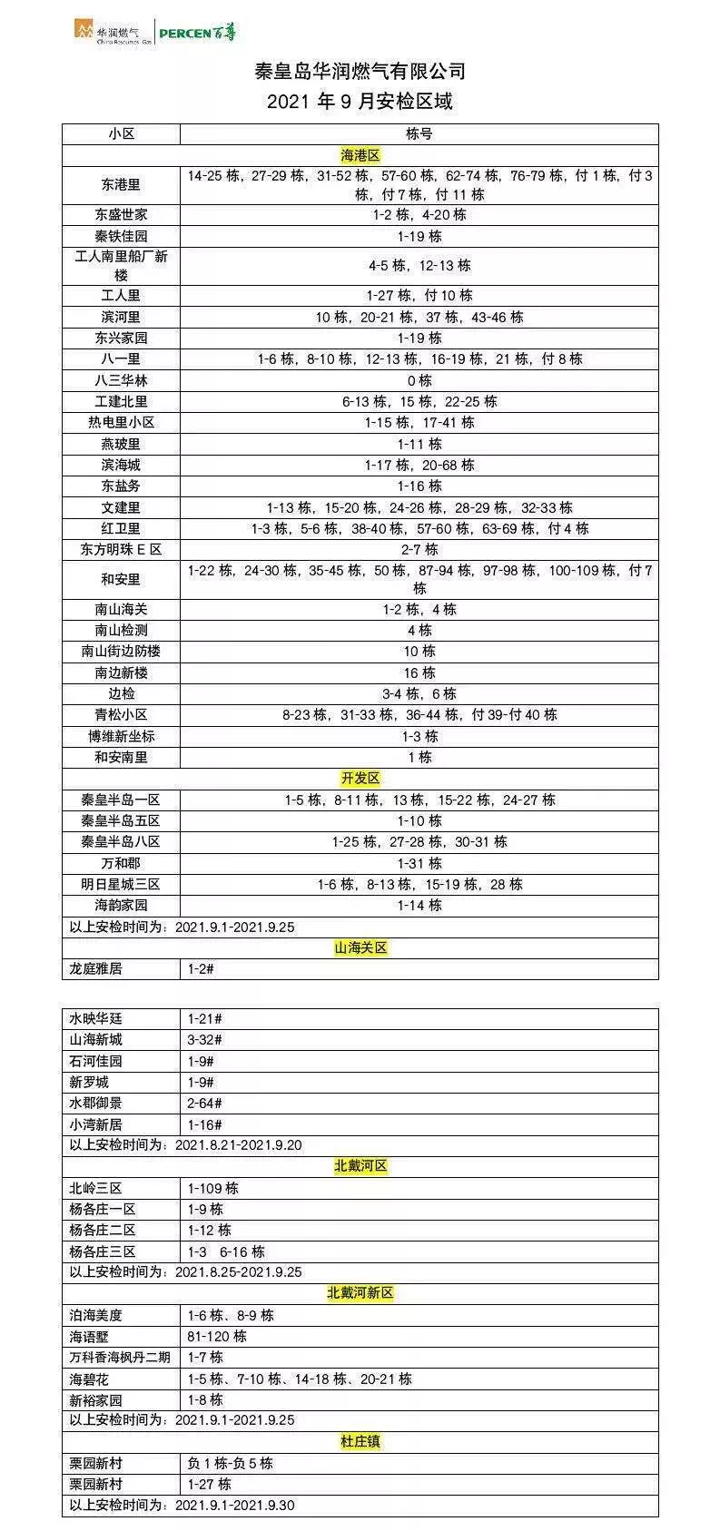 秦皇岛华润燃气有限公司2021年9月份安检区域,快来看看有您家吗?