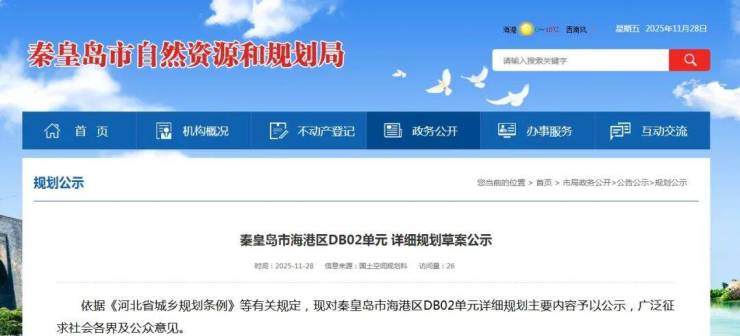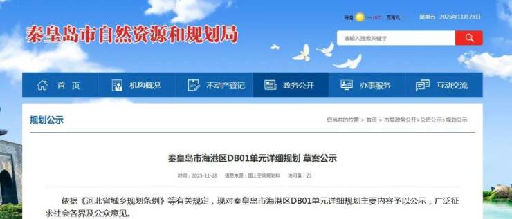 日前,秦皇岛市自然资源和规划局发布《秦皇岛市海港区DB01单元详细规划草案公示》,主导功能为商业服务、工业、物流仓储。