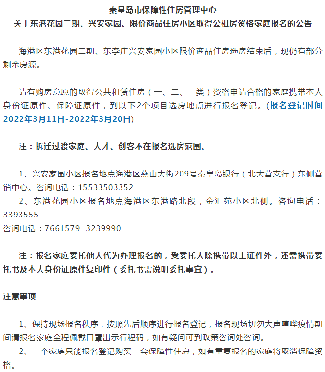 秦皇岛市保障性住房管理中心关于东港花园二期、兴安家园、限价商品住房小区取得公租房资格家庭报名的公告
