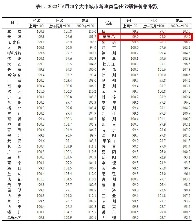 7月15日,国家统计局公布了6月70个大中城市商品住宅销售价格指数。数据显示,秦皇岛新房、二手房房价6月份继续下行,新房房价6月环比下跌1%、同比下跌6%;二手房房价环比下跌0.5%、同比下跌3.5%。