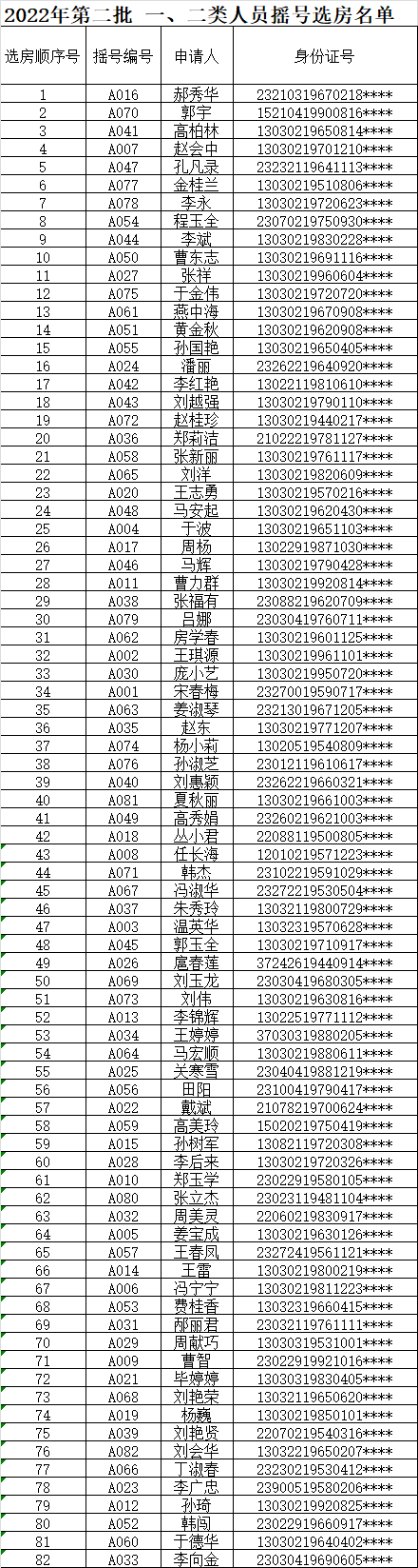 本次选房家庭范围为海港区(含开发区西区)经审核合格的公租房一、二、三类住房保障家庭及人才公寓住房保障家庭,分别与2022年9月28日上午在“秦皇岛市第一公证处官方微博”和“快手app” 网络直播方式进行摇号的家庭,通过网络直播方式摇号结束后并公示合格的公租房第一批次一、二类选房家庭 82户;第二批次三类选房家庭440户。2023年2月15日上午摇出C类人才8户,D类人才221户。(附选房批次人员名单)