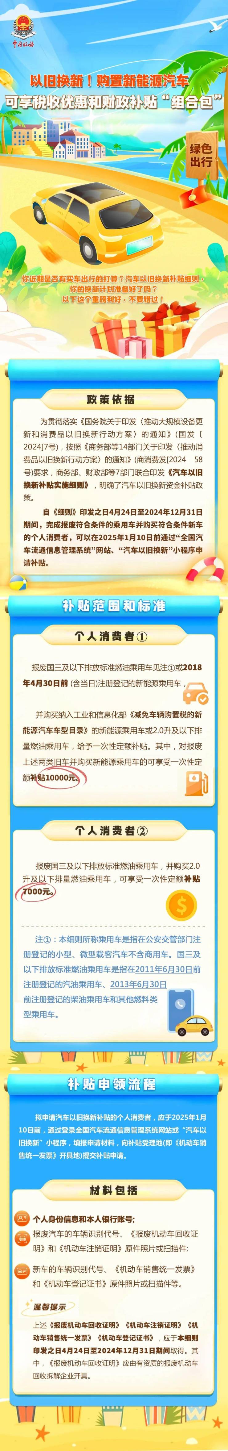 (五)拟补贴申请时间为自2024年4月24日起,至2025年1月10日止。申请汽车以旧换新补贴资金的个人消费者,应于2025年1月10日前,通过登录全国汽车流通信息管理系统网站“汽车以旧换新专题”栏目或支付宝、抖音、微信、云闪付平台首页搜索“汽车以旧换新”小程序进入申请,填报个人身份信息,报废汽车的车辆识别代号、《报废机动车回收证明》和《机动车注销证明》原件照片或扫描件,新车的车辆识别代号、《机动车销售统一发票》和《机动车登记证书》原件照片或扫描件等,向补贴受理地(即《机动车销售统一发票》开具地)提交补贴申请。