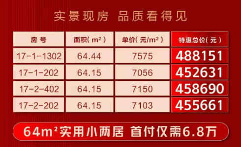 本次加推的17#楼为实景现房,品质可见即所得,部分房源单价低至 7056元/㎡起,特惠总价 45.2万元起,其中64㎡的实用小两居户型首付6.8万就可以买到,降低置业门槛。