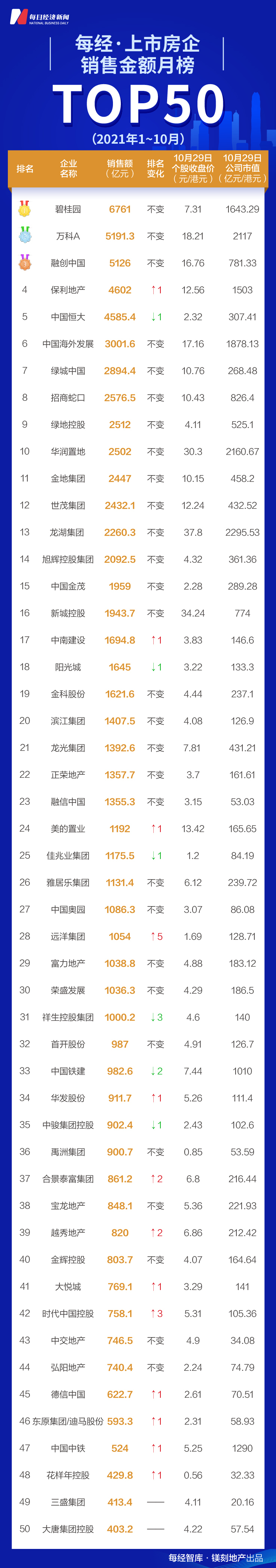 2021年9月,TOP50上市房企单月销售额合计仅7000亿元;而10月更差,十一黄金周并未能带来任何起色,TOP50上市房企单月销售额合计降至6900亿元。