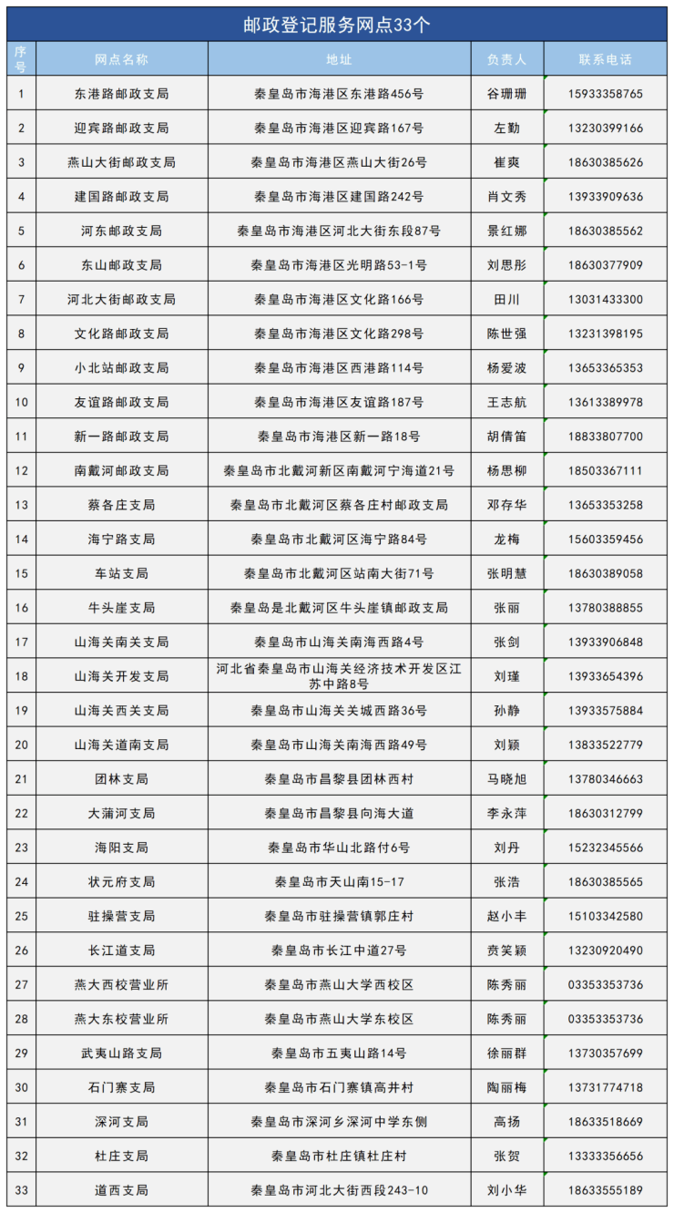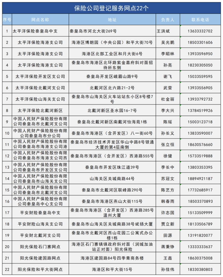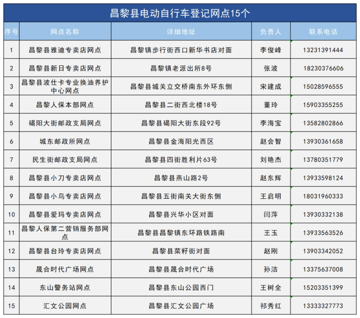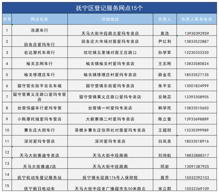 为确保5月1日顺利开展电动自行车统一上牌工作,让市民朋友“就近办、便捷办”,秦皇岛市首批共设立电动自行车固定登记服务网点115个,流动登记服务网点20个。(滑动查看完整表格)