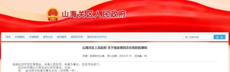 杨 金为西关街道办事处主任(试用期一年);