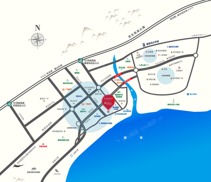 项目周边旅游资源丰富多彩,拥有秦皇岛大多优质景区,门口就有4a级大型海洋博览馆——新澳海底世界;西侧有金海湾森林公园、秦皇岛野生动物园、观鸟湿地、鸽子窝公园,均在20分钟车程。在医疗配套上,项目距大型三甲医院秦皇岛市中医院也仅有3公里左右的距离,看病就医方面还是比较方便的。