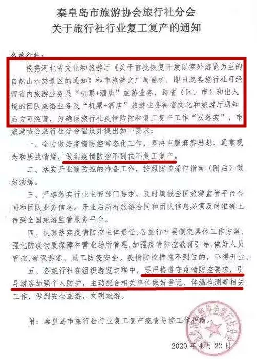 根据通知,4月22日起,各旅行社可经营省内旅游业务及“机票+酒店”旅游业务。但是,跨省(区、市)和出入境的团队旅游业务及“机票+酒店”旅游业务待省文化和旅游厅通知后方可经营。各旅行社疫情防控措施不到位的,不得开业。7