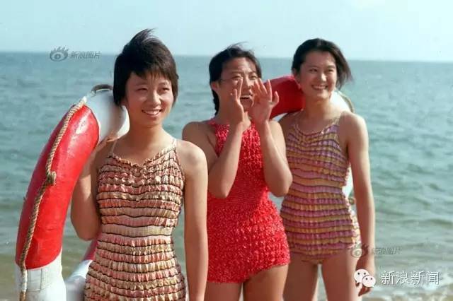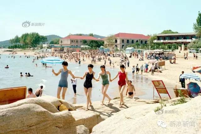 北戴河休养区疗养机构向普通游客开放,一般是一半提供机关单位的人休养,一半用于接待游客。一些老人回忆,八九十年代,很容易在北戴河见到领导人,有的游客还要求与邓小平合影。图为1979年夏天,北戴河海边的泳装姑娘们。摄影:孙振
