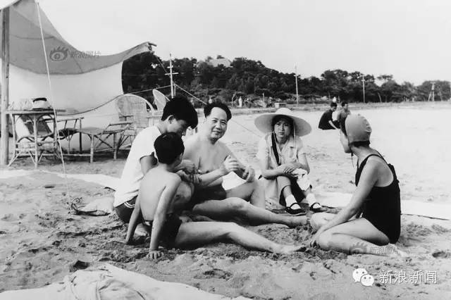 毛泽东是1954年才第一次来到北戴河的,住在张学良曾经住过的“章家楼”里。喜欢搏击风浪的他常常带着女儿侄子们一起游泳。这年夏天,他写下了著名的《浪淘沙·北戴河》。图为1954年,毛泽东和女儿李纳、李敏、侄子毛远新在北戴河浴场。