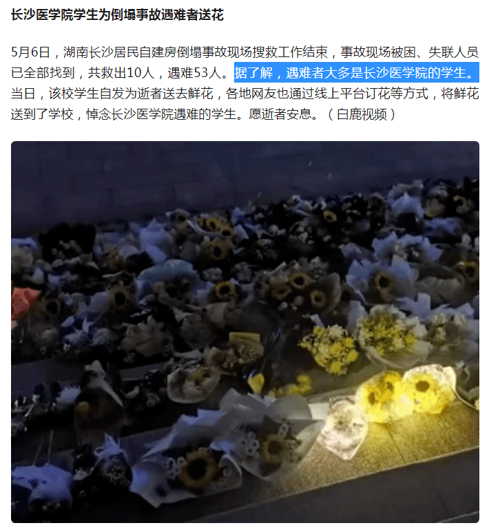5月6日3时零3分,长沙居民自建房倒塌事故现场搜救工作结束,事故现场被困、失联人员已全部找到,共救出10人,遇难53人。