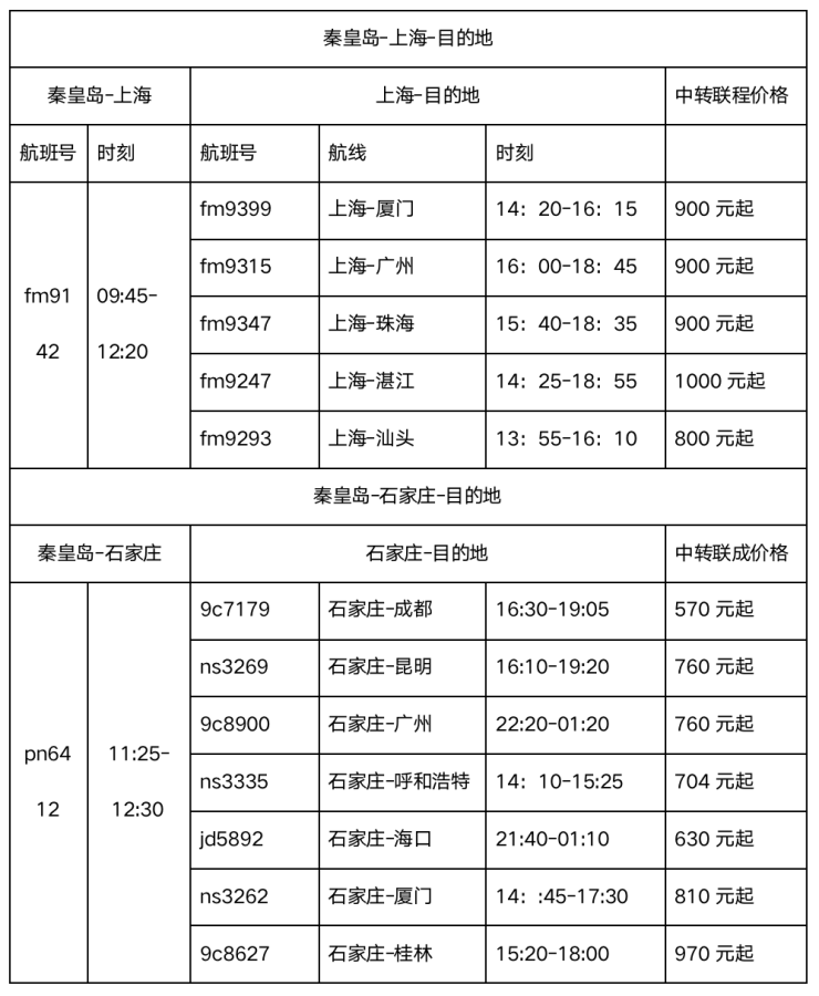 经石家庄、上海中转全国、连通世界。航线网络覆盖全国。旅客从秦皇岛机场出发,可选择任意航空公司任意航班中转组合。购买任意航班组合即享高性价比优惠,比分别购买两段中转航班价格更优惠。服务实现无忧中转。中转联程旅客…