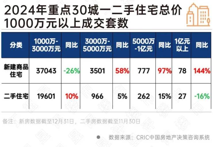 据CRIC监测数据,30个重点城市一二手3000万以上高端住宅2024年分别成交4356套和1255套,同比分别增长64%和6%,新房增幅显著高于二手房。
