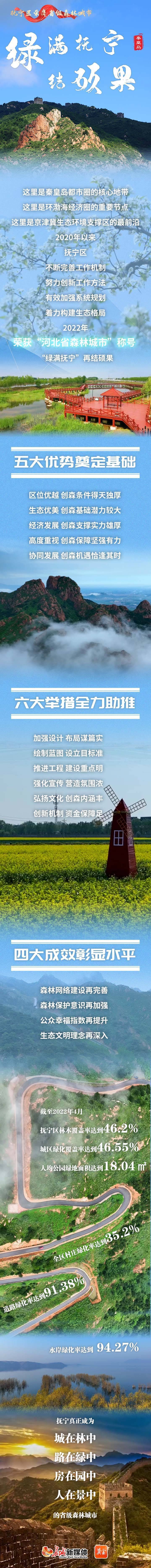 如今的抚宁,爱绿、护绿、植绿、兴绿蔚然成风。截至2022年4月,全区林木覆盖率达到46.2%,城区绿化覆盖率达到46.55%,人均公园绿地面积达到18.04㎡;全区村庄绿化率达到35.2%,道路绿化率达到91.38%,水岸绿化率达到94.27%,抚宁真正成为“城在林中、路在绿中、房在园中、人在景中”的省级森林城市。
