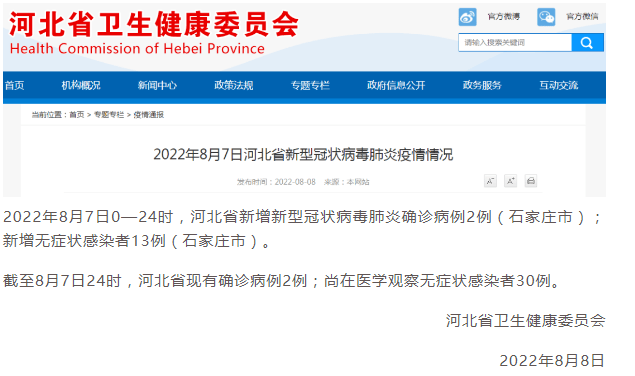 2022年8月7日0—24时,河北省新增新型冠状病毒肺炎确诊病例2例(石家庄市);新增无症状感染者13例(石家庄市)。