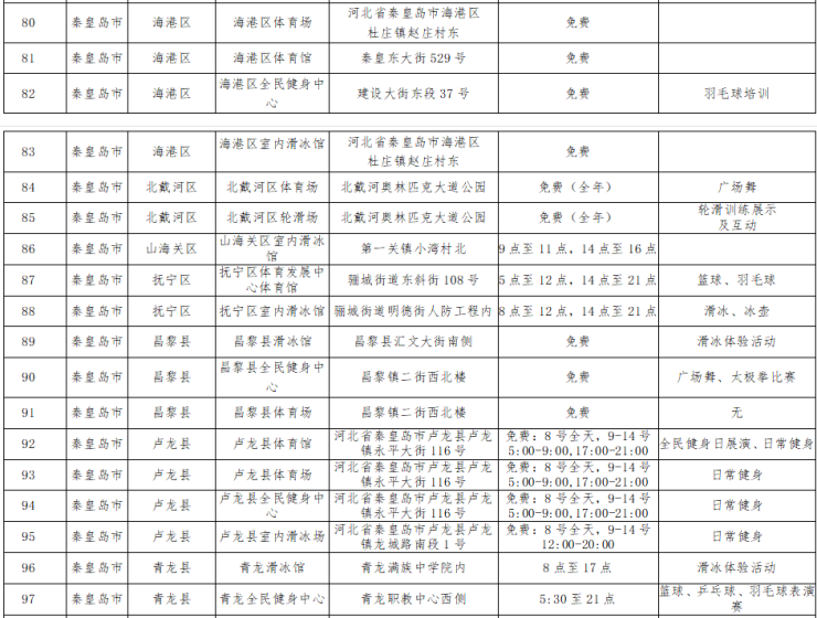2022年8月8日是第14个“全民健身日”,全省将有302所公共体育场馆在2022年“全民健身日”期间(8月8日—14日)向社会免费或低收费开放,快来看看秦皇岛都有哪些场馆吧。(点击图片放大查看)