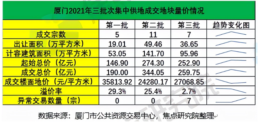 《每日经济新闻》记者注意到,厦门从排名前列批集中土拍到年底的第三批集中土拍,整体而言呈现出前热后冷的态势。其中,排名前列批集中土拍成交5宗地块,成交金额190亿元,成交楼面价为3.58万元/平方米;第二批集中土拍成交11宗地块,成交金额344亿元,成交楼面价为2.43万元/平方米。
