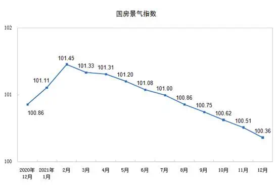 与此同时,综合反映全国房地产业发展景气状况的“国房景气指数”显示:2021年12月份指数仅为100.36,不仅跌破全年较低值,且比2020年12月还降了0.5个点,这表明年关之际的房地产市场仍未走出“寒冬”。