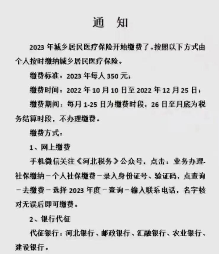 2023年度城乡居民基本医疗保险开始申报了,缴费标准每人每年350元,缴费期限截至2022年12月25日。缴费方式多样,自主申报可通过“河北税务”微信公众号、微信城市服务、电子税务局、冀时办APP、支付宝、河…