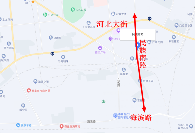 民族路向南延伸工程北起河北大街,南至海滨路,长约1750米(中线交点距离),实施长度约1924米(含桥长545米),本段道路等级为城市主干路,规划红线宽50米。
