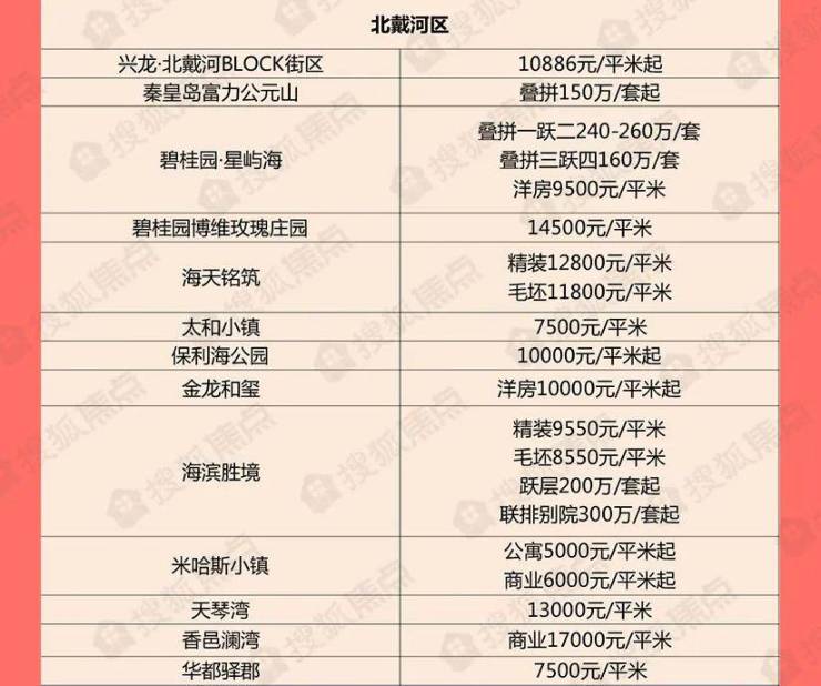 房价调整的楼盘主要分布在海港区,包括:海碧台、皓月·天誉、兴桐鑫城十区、金洋戴河湾。汤河片区的中冶德贤华府三期起价14000元/㎡,上调100元。