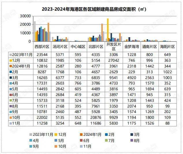 11月份,北戴河新区成交面积约为0.55万㎡,环比增长4%;海港区成交面积环比下跌明显,成交面积约3.55万㎡,环比下跌42%。