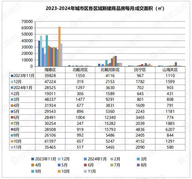 11月份,秦皇岛房地产市场5大区域(含北戴河新区)新房成交面积,只有北戴河新区成交环比上浮,海港区、抚宁区、北戴河区及山海关区成交环比下跌。