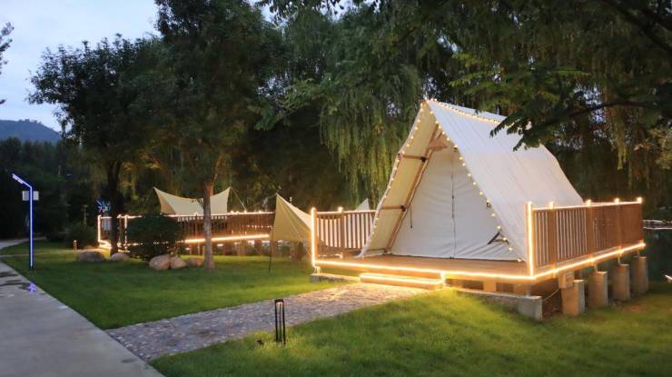 园区近期开放的“院里野趣”户外湖畔露营基地,占地约2000㎡。是度假村为实现户外休闲生活理想家们,提供的一站式精致露营与度假体验基地。涵盖:湖畔露营、野餐住宿、林间垂钓、亲子互动等多种形式。配有露天影院、放声联唱、剧本杀、狼人杀等多种休闲主题娱乐。让久居都市人们,在这片山水之境享受到难得的畅意。