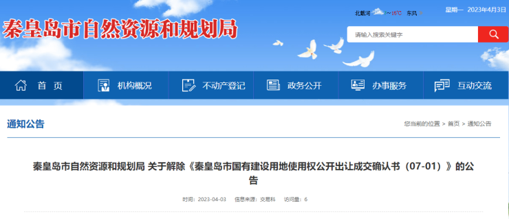 秦皇岛市自然资源和规划局 关于解除《秦皇岛市国有建设用地使用权公开出让成交确认书(07-01)》的公告