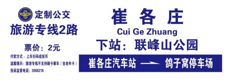 崔各庄汽车站始发行驶联峰北路、剑秋路、联峰路、鹰角路、金山嘴路、东海滩路、海波路、鸽赤路至鸽子窝停车场。