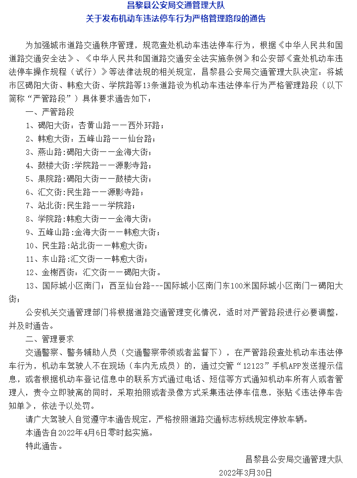 昌黎县公安局交通管理大队决定将城市区碣阳大街、韩愈大街、学院路等13条道路设为机动车违法停车行为严格管理路段。