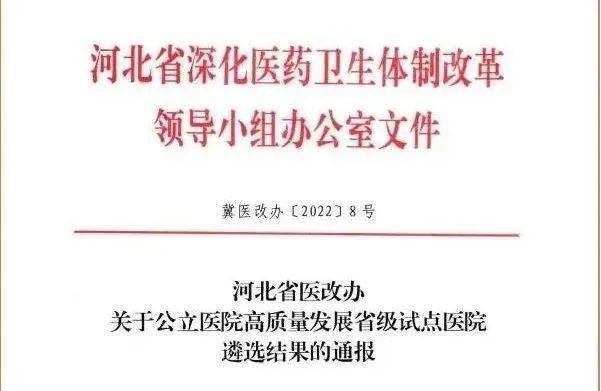 省医改办组织开展了公立医院高质量发展省级试点医院遴选工作,经过资格审核、专家评审、数据评价、综合评定,秦皇岛市排名前列医院作为少有一家地市级医院,从38家候选单位中脱颖而出,成为全省仅有的3家“公立医院高质量发展省级试点医院”之一。