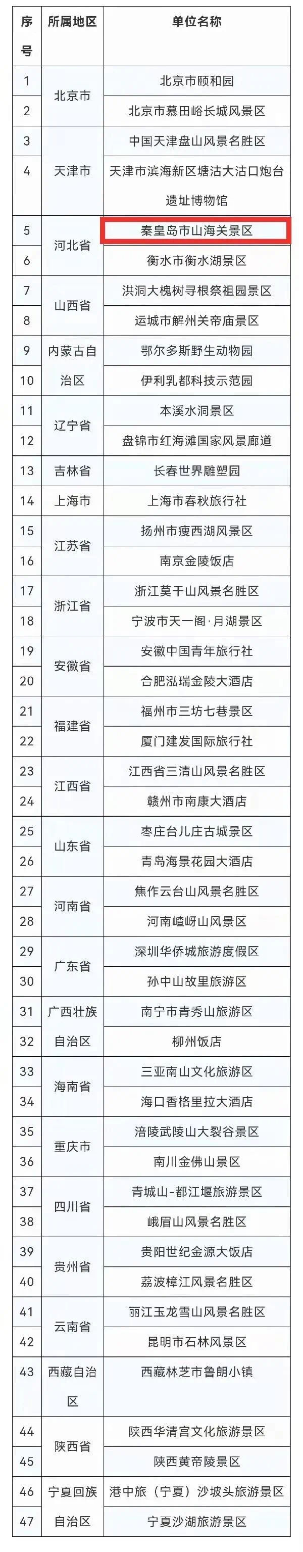 47家单位达到高级文明旅游示范单位标准,山海关入选!