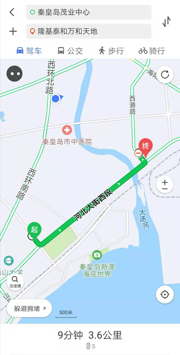 两地距离约为3.6公里,共经过5个红绿灯,驾车时间约为9分钟。