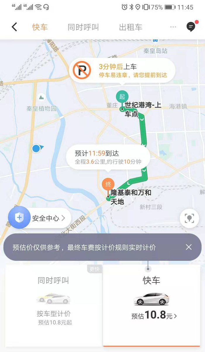 在快车司机的专业驾驶下,预计需要11分钟到达,需支付10.8元。