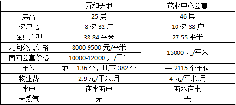 从表格中可以看到,万和天地层高较低,乘梯压力较小,户型区间更大,可供业主选择的空间大,售价更低,物业费差距较大,万和天地生活成本更少,适合年轻人或投资置业者选择。