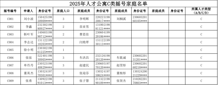 3.摇号采取摇取申请家庭编号(带字母)的方式,其中字母C代表C类人才(例如C001),字母D代表D类人才(例如D001)。请申请家庭在附件名单中查询自己编号。