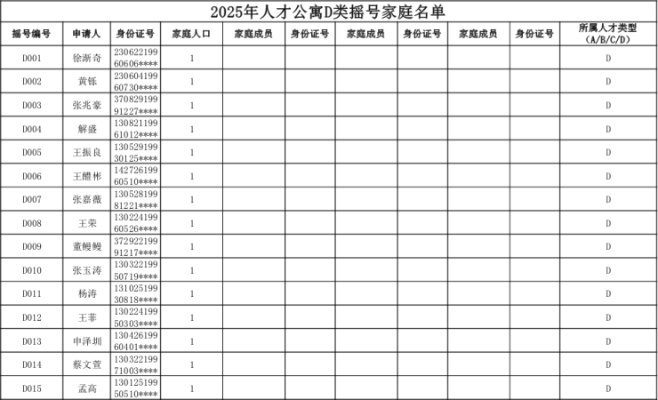 人才公寓申请并公示合格的C类和D类人才共计215户,其中C类人才9户、D类人才206户。(名单详见附件)
