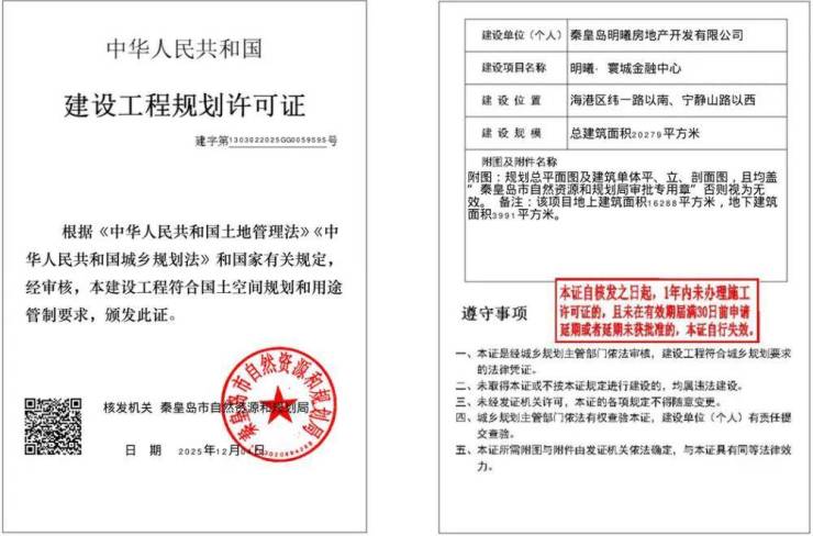 近日,秦皇岛市自然资源和规划局正式核发了“明曦·寰城金融中心”项目的《建设工程规划许可证》。