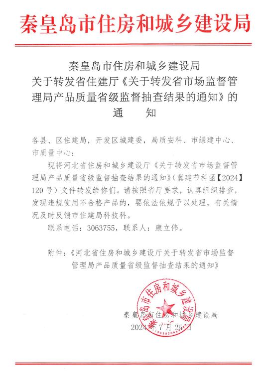 近日,秦皇岛市住建局官网发布消息转发省住建厅《关于转发省市场监督管理局产品质量省级监督抽查结果的通知》,要求各县、区住建局,开发区城建委,局质安科、市绿建中心、市质量中心: