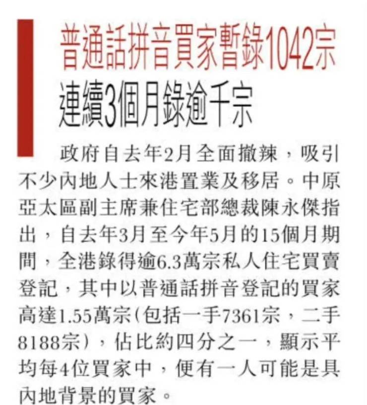 据莱坊地产报告显示,今年一季度香港住宅成交量同比增长180%,内地买家占比高达38%,重返2016年“扫货”高峰期水平。