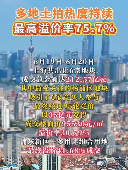 6月24日,上海5宗地块扎堆出让,4宗溢价成交、1宗底价成交,总成交金额191.57亿元。其中,位于市中芯杨浦区地块吸引了6家竞买人参与,经过95轮竞价,由保利发展以35亿元竞得,成交楼面价95530元/㎡,溢价率30.79%。