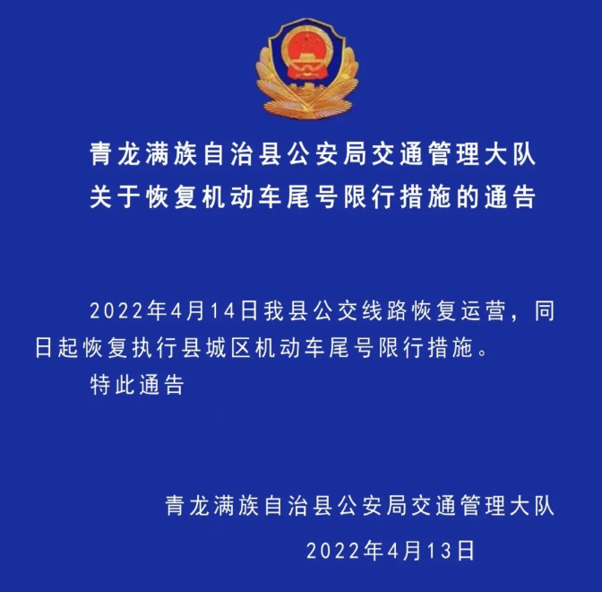 秦皇岛市青龙县恢复公交、限行