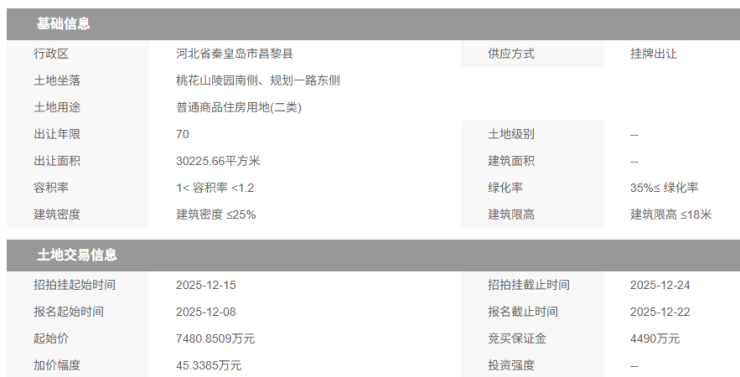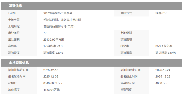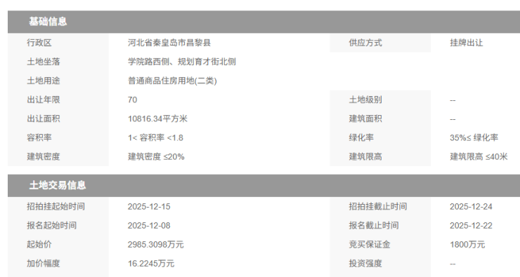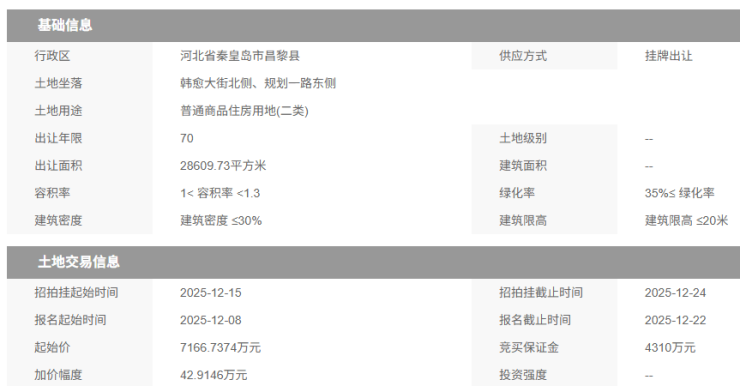 12月份,土拍市场再迎集中出让高峰,继海港区挂牌出让7宗住宅地块后,昌黎县日前也集中挂牌出让7宗居住用地,并将于12月24日竞拍。