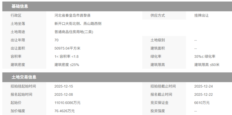 11月底,嘉境(河北)房地产开发有限公司以约2.8亿元的总价竞得抚宁区一宗93188.40㎡的住宅用地,创下今年土拍市场宗地面积与成交总价两项纪录。