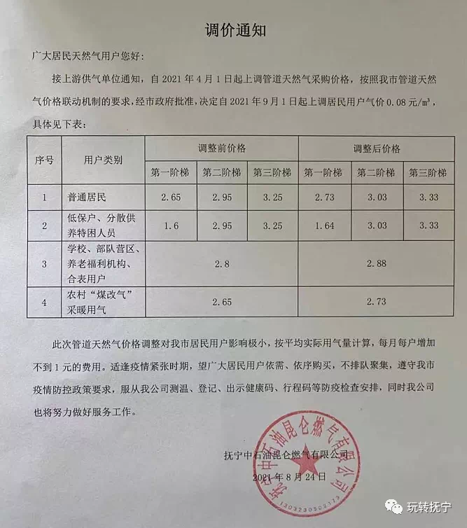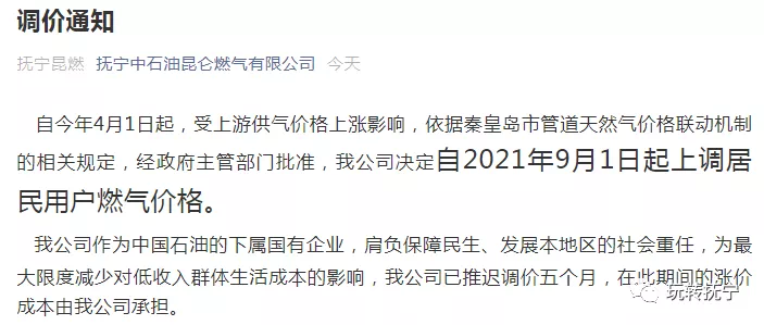 8月27日,秦皇岛华润燃气发布调价通知:经过市政府批准,秦皇岛华润燃气有限公司决定自2021年9月1日起对供气区域内天然气居民用气价格上调0.08元/m³。今天,抚宁中石油昆仑燃气公司也发出了调价公告,自9月1日起上调用户气价0.08元。