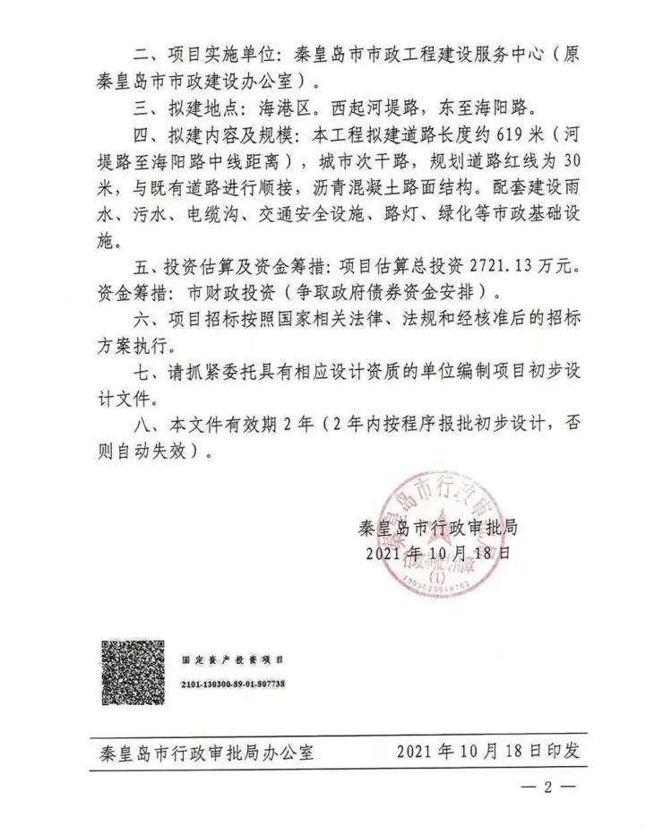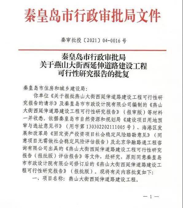 ※ 2021年10月18日,秦皇岛燕山大街西延伸道路建设工程的可行性研究报告获得批复。